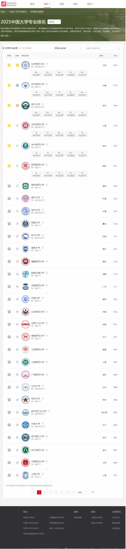 2025年6月18日,高等教育专业评价机构软科正式发布2025“软科中国大学专业排名”。hy590海洋之神检测中心思想政治教育本科专业以全国第12名的成绩再次进入A类行列,继2022年31名、2023年28名、2024年23名,排名继续稳步提升。