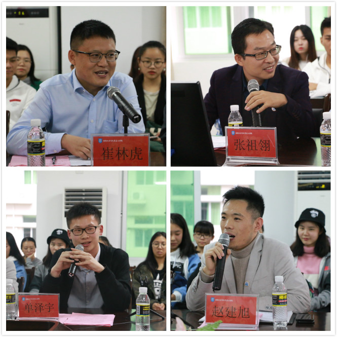 员工崔林虎、张祖翎、赵建旭、单泽宇在论坛上分别做了经验分享,纷纷表达了对公司及母校的思念,并对能够参加这次论坛感到荣幸。他们从自我经验出发,分别从日常学习困惑、员工干部定位、考研准备、就业方向、创业发展等多方面进行指导,言简意赅的表达与亲切的沟通方式唤起了很多同学的共鸣,并积极与现场师生进行交流互动,共同讨论生活与学习方面的困扰,现场气氛轻松活跃。