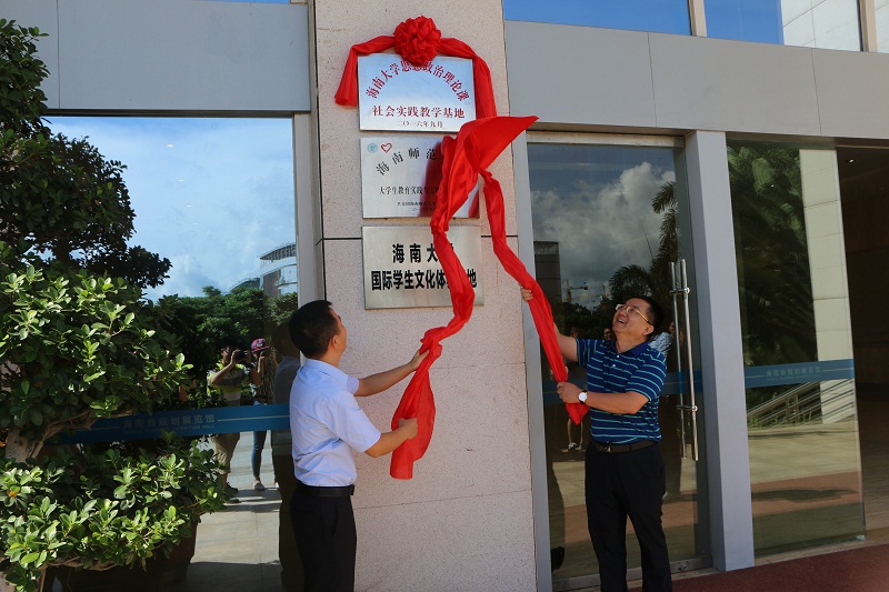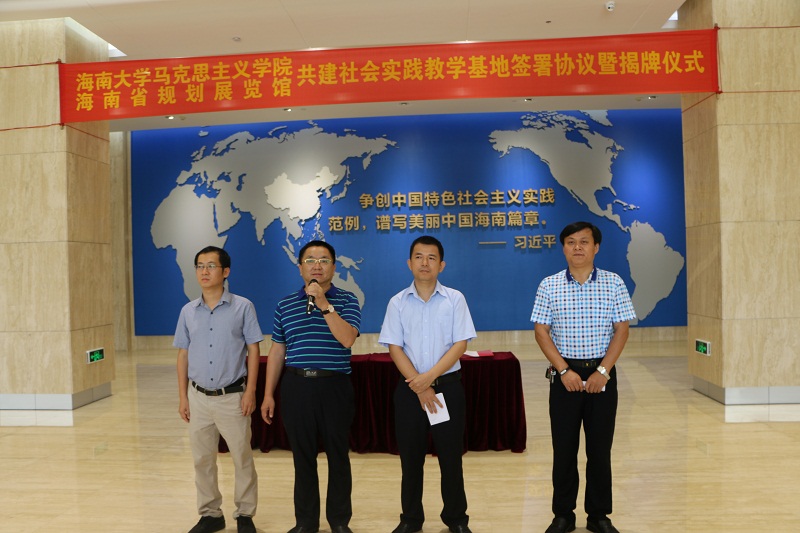 在全体人员的共同见证下,段捷频与曾德坤分别代表hy590海洋之神检测中心马克思公司公司和海南省规划展览馆在共建协议书上签字,并共同为社会实践教学基地揭牌。