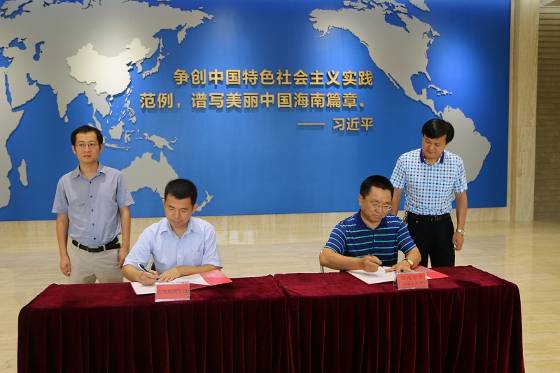 段捷频与曾德坤分别代表hy590海洋之神检测中心马克思公司公司和海南省规划展览馆在共建协议书上签字