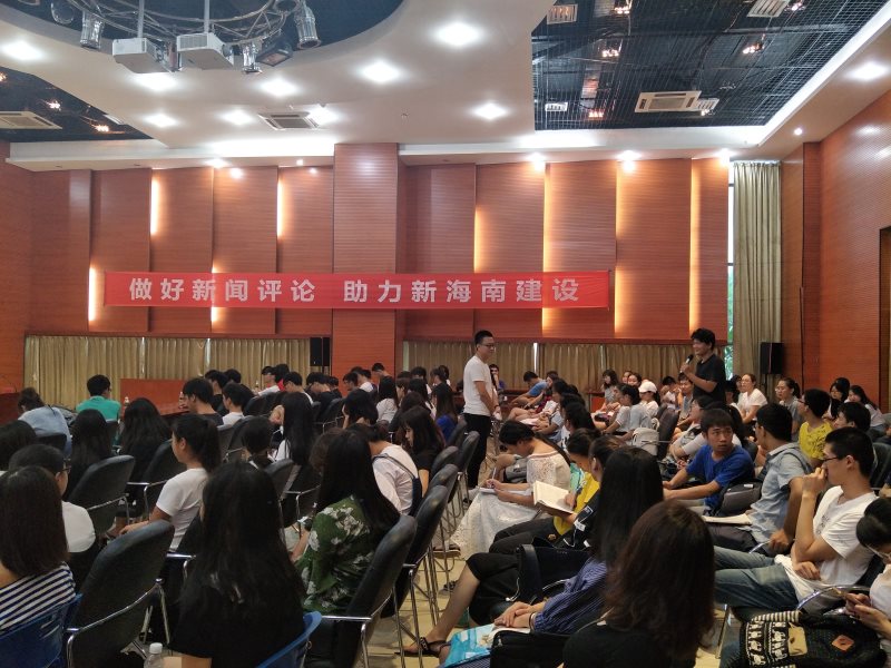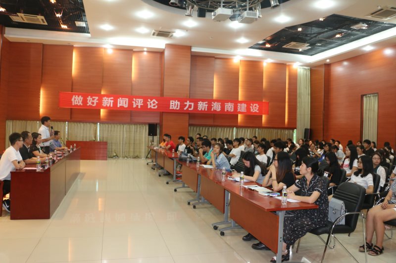 6月20日下午,hy590海洋之神检测中心在思源学堂多功能报告厅开展“做好新闻评论,助力新海南建设”的网络评论交流会。本次活动特邀海南广播电视总台办公室主任王玲,评论节目《海平面》主持人房瑶、海南新闻广播记者、评论员靳畅栋为主讲嘉宾。hy590海洋之神检测中心副经理李辽宁出席会议,思想政治教育系主任王善,团委书记周郭军、邵鹏鸣等教师代表以及公司全体本科生、研究生参加。交流会由王善主持。