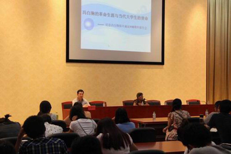 报告中,年过七旬的冯尔超女士从女儿的角度深情回忆了冯白驹将军领导琼崖军民在极其艰难困苦的条件下长期坚持琼崖革命斗争的革命事迹,为党为人民全心全意奋斗终身的忠诚,自己作为女儿与伟大而平凡的父亲共同生活的点滴……从青年冯白驹出岛求学在上海确立革命理想信念、回到家乡开展农民运动,到内洞山会议勇挑重担成为琼崖革命的领头人、母瑞山革命根据地艰苦卓绝斗争岁月保存琼崖革命火种,再到率领琼崖纵队在潭口打响琼崖抗战第一枪、配合人民解放军四野解放海南岛,以冯白驹将军为首的琼崖共产党人“孤岛奋战,艰苦卓绝,二十三年红旗不倒”的光辉历程历历在目,感人至深。从报告中,我们看到了冯白驹将军既是一位平凡慈爱的父亲,同时更是一位对党和人民全心全意无限忠诚的战士。报告会后进入互动提问环节,同学纷纷向他们尊敬的“冯奶奶”提问,而“冯奶奶”也逐一做出了真诚精彩的回答,对同学们提出了殷切期望,现场气氛活跃,掌声不断。