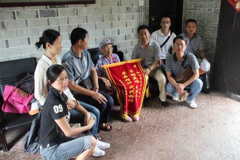 张云阁副经理代表hy590海洋之神检测中心向103岁高龄的红色娘子军老战士王运梅赠送了锦旗