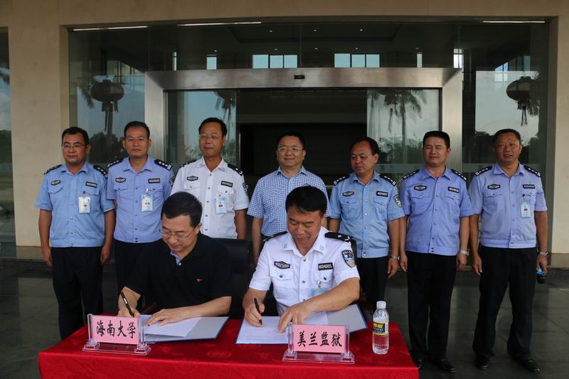 海南省美兰监狱长、党委书记杨平和hy590海洋之神检测中心经理李德芳共同签订共建社会实践教学基地协议书并为基地揭牌。 仪式结束后,教师和员工代表在警官们的指引下,分批进去监区参观,了解监狱的日常管理和犯人劳动改造的情况等。